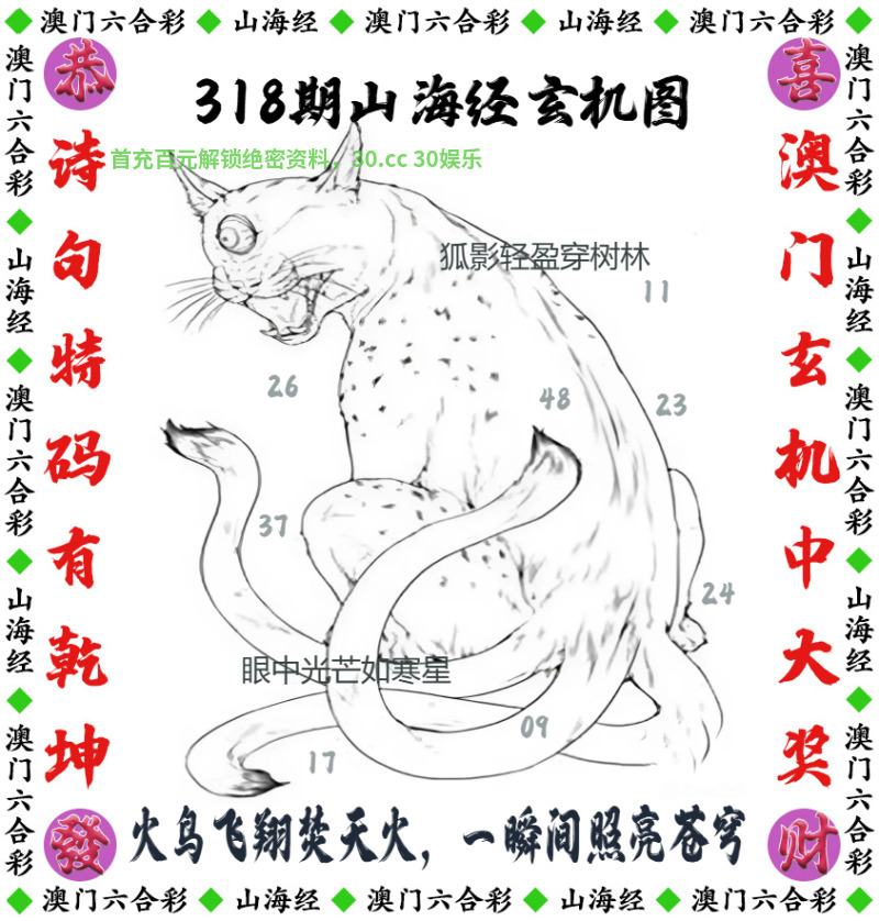 318期:【山海经玄机】开鼠06 解释:狐影轻盈穿树林,眼中光芒如寒星解羊马兔 解料:火鸟飞翔焚天火,一瞬间照亮苍穹解鼠龙鸡 综合:羊马鼠龙鸡兔 |