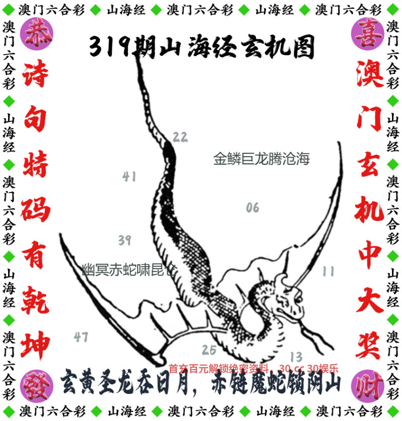 319期:【山海经玄机】开鸡45 解释:金鳞巨龙腾沧海,幽冥赤蛇啸昆仑解蛇羊鸡 解料:玄黄圣龙吞日月,赤链魔蛇锁阴山解狗兔猪 综合:蛇羊狗兔猪鸡 主特:13.25.11.47.08.44.03.15.07.19.09.45 |